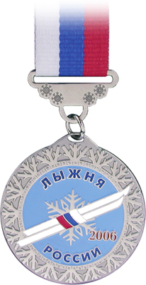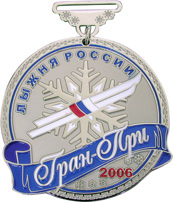 ЛЫЖНЯ РОССИИ ГРАН-ПРИ 2006 Латунь, мягкая эмаль Размеры: 65,5х65 мм (подвеска) 29х17 мм (колодка) Цвет покрытия: серебряный 2005 год |