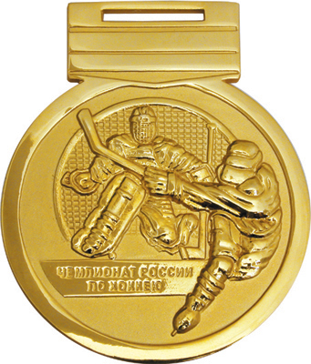 ПЕРВЕНСТВО РОССИИ ПО ХОККЕЮ 2005-2006 ФЕДЕРАЦИЯ ХОККЕЯ РОССИИ Латунь, без эмали (аверс, реверс) Размеры: Ø 50 мм Варианты цвета покрытия: золотой, серебряный, бронзовый |