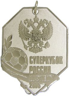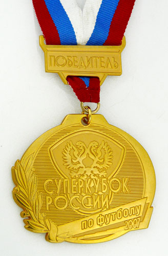 СУПЕРКУБОК РОССИИ ПО ФУТБОЛУ 2007 ПОБЕДИТЕЛЬ РОССИЙСКАЯ ФУТБОЛЬНАЯ ПРЕМЬЕР-ЛИГА – 200 Латунь, без эмали (аверс) Латунь, мягкая эмаль (реверс) Размеры: 70х63 мм (подвеска) 42х25 мм (колодка) Варианты цвета покрытия: золотой, серебряный, бронзовый |