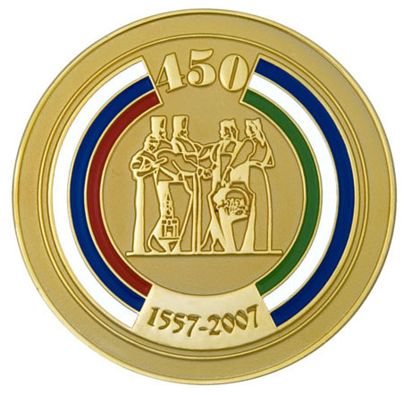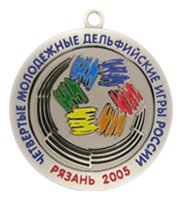 ЧЕТВЕРТЫЕ МОЛОДЕЖНЫЕ ДЕЛЬФИЙСКИЕ ИГРЫ РОССИИ РЯЗАНЬ 2005 Латунь, мягкая эмаль Размеры: Ø 50 мм Варианты цвета покрытия: золотой, серебряный, бронзовый 2005 год |