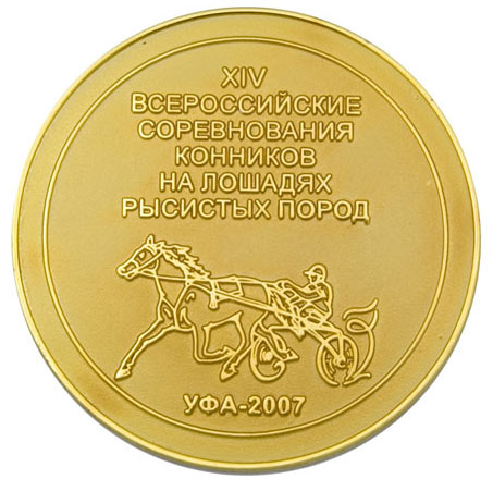 XIV ВСЕРОССИЙСКИЕ СОРЕВНОВАНИЯ КОННИКОВ НА ЛОШАДЯХ РЫСИСТЫХ ПОРОД УФА – 2007 Латунь, без эмали (аверс) Латунь, мягкая эмаль (реверс) Размеры: Ø 70 мм Цвет покрытия: золотой
