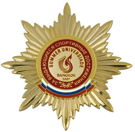 ЗА ВЫДАЮЩИЕСЯ СПОРТИВНЫЕ ДОСТИЖЕНИЯ SUMMER UNIVERSIADE BANGKOK 2007 Латунь, мягкая эмаль (аверс, подвеска, колодка) Латунь, без эмали (реверс, подвеска, колодка) Размеры: 111 х 141мм (подвеска с колодкой) Цвет покрытия: золотой |