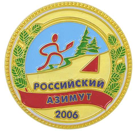РОССИЙСКИЙ АЗИМУТ 2006 Латунь, мягкая эмаль (аверс, реверс) Размеры: Ø 50 мм Цвет покрытия: золотой |