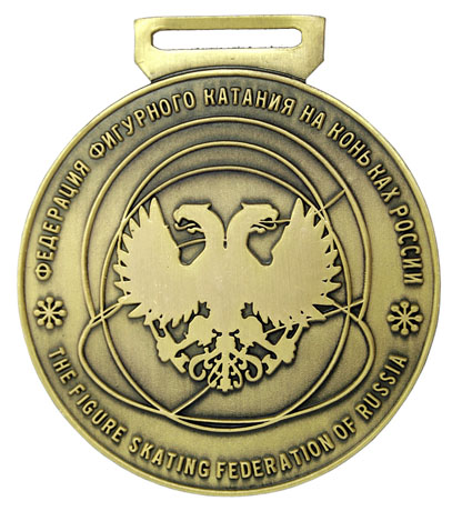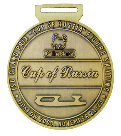 ISU GRAND PRIX «CUP OF RUSSIA» FIGURE SKATING MOSCOW 2003 NOVEMBER 21-23 ФЕДЕРАЦИЯ ФИГУРНОГО КАТАНИЯ НА КОНЬКАХ РОССИИ Латунь, без эмали (аверс, реверс) Размеры: Ø 60 мм Варианты цвета покрытия: золотой, серебряный, бронзовый |