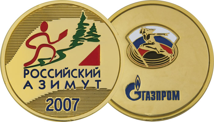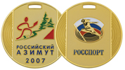 РОССИЙСКИЙ АЗИМУТ – 2007 РОССПОРТ Латунь, мягкая эмаль (аверс, реверс) Размеры: Ø 50 мм Цвет покрытия: золотой |