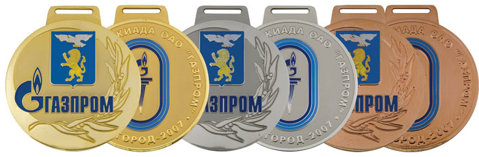 ГАЗПРОМ СПАРТАКИАДА ОАО «ГАЗПРОМ» 2007 Латунь, мягкая эмаль (аверс, реверс) Размеры: Ø 80 мм Варианты цвета покрытия: Золотой, серебряный, бронзовый |