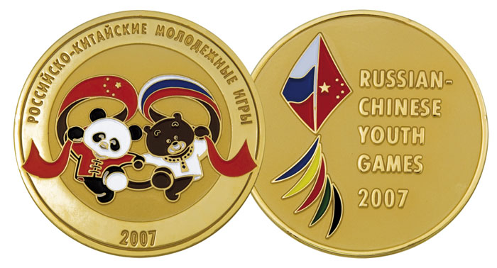 РОССИЙСКО-КИТАЙСКИЕ МОЛОДЕЖНЫЕ ИГРЫ 2007 Латунь, мягкая эмаль (аверс, реверс) Размеры: Ø 60 мм Цвет покрытия: золотой |