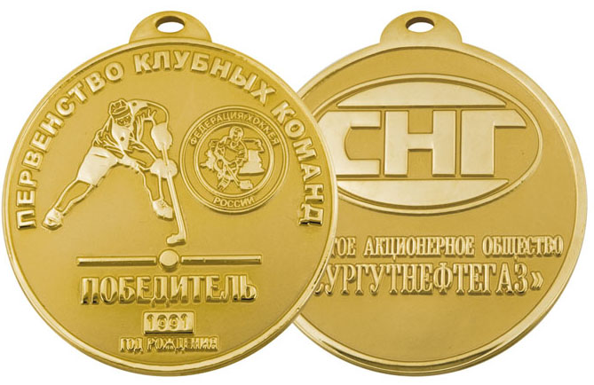 ФЕДЕРАЦИЯ ХОККЕЯ РОССИИ ПЕРВЕНСТВО КЛУБНЫХ КОМАНД СУРГУТНЕФНЕГАЗ Латунь, без эмали (аверс, реверс) Размеры: Ø 70 мм Цвет покрытия: золотой |