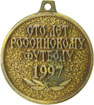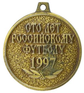 СТО ЛЕТ РОССИЙСКОМУ ФУТБОЛУ Латунь, без эмали (аверс и реверс) Размеры: Ø 50 мм Цвет покрытия: золотой 1997 год |