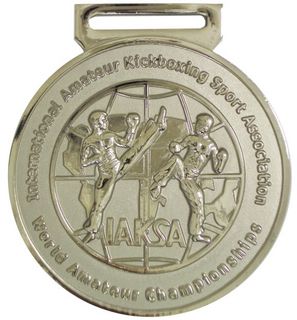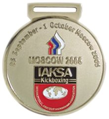 MOSCOW 2005 IAKSA KICKBOXING Латунь, без эмали (аверс) Латунь, мягкая эмаль (реверс) Размеры: Ø 70 мм Варианты цвета покрытия: золотой, серебряный, бронзовый 2005 год |
