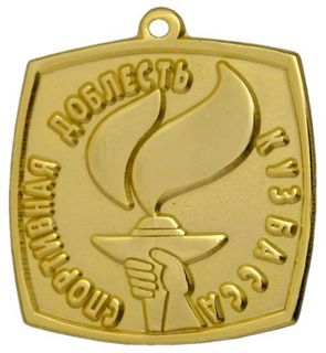 СПОРТИВНАЯ ДОБЛЕСТЬ КУЗБАССА Железо, без эмали Размеры: 27х27 мм Цвет покрытия: золотой 1995 год |