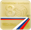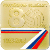 РОССИЙСКОМУ ВОЛЕЙБОЛУ 80 ЛЕТ Латунь, мягкая эмаль Размеры: 60х60 мм Цвет покрытия: золотой 2003 год |