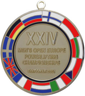 XXIV MENS EUROPE POWERLIFTING CHAMPIONSHIPS Латунь, твердая эмаль (аверс) Латунь без эмали (реверс) Размеры: Ø 68 мм Варианты цвета покрытия: золотой, серебряный, бронзовый 2001 год |