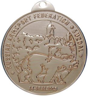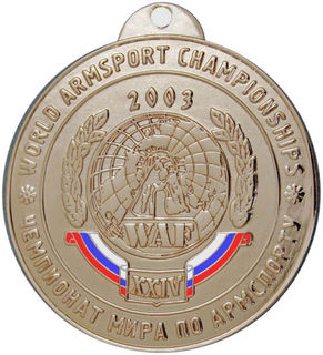 WORLD ARMSPORT CHAMPIONSHIPS 2003 Латунь, мягкая эмаль (аверс) Латунь, без эмали (реверс) Размеры: Ø 60 мм Варианты цвета покрытия: золотой, серебряный 2003 год |
