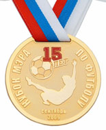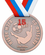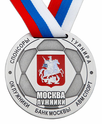 Наградные медали КУБОК МЭРА ПО ФУТБОЛУ 15 ЛЕТ сентябрь 2009 (аверс) МОСКВА – ЛУЖНИКИ СПОНСОРЫ ТУРНИРА ОК ЛУЖНИКИ, БАНК МОСКВЫ, АВМ СПОРТ (реверс) Латунь, мягкая эмаль (аверс, реверс) Размеры: Ø 70 мм Варианты цвета покрытия: золотой, серебряный, бронзовый |