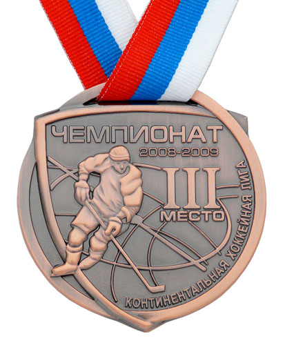 КОНТИНЕНТАЛЬНАЯ ХОККЕЙНАЯ ЛИГА ЧЕМПИОНАТ 2008-2009, III МЕСТО (аверс) КХЛ (реверс) Латунь, без эмали (аверс, реверс) Размеры: Ø 70 мм Варианты цвета покрытия: золотой, серебряный, бронзовый |