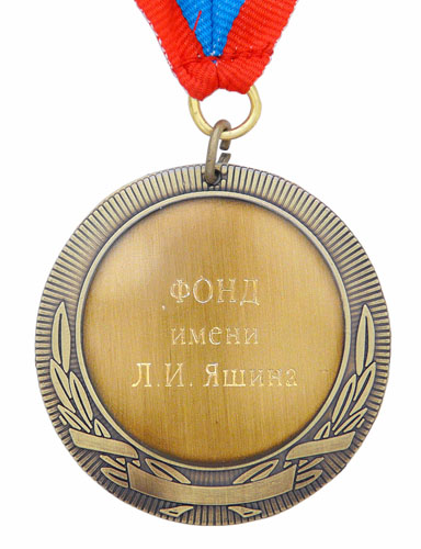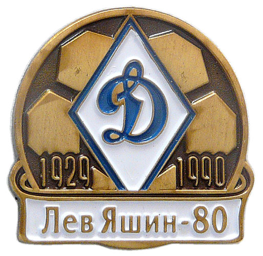 Памятная медаль XIX ТУРНИР ВЕТЕРАНОВ ПАМЯТИ Л. ЯШИНА 2009 г. (аверс) ФОНД имени Л.И. Яшина (реверс) Латунь, без эмали Заливной вкладыш на аверсе (O 25 мм) Размеры: O 50 мм Цвет покрытия: золотой и бронзовый Значок ЛЕВ ЯШИН – 80 1929 – 1990 Латунь, мягкая эмаль Размеры: 17х17 мм Застёжка: цанга |