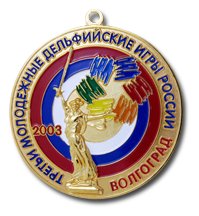 ТРЕТЬИ МОЛОДЕЖНЫЕ ДЕЛЬФИЙСКИЕ ИГРЫ РОССИИ ВОЛГОГРАД 2003 Латунь, мягкая эмаль Размеры: Ø 50 мм Варианты цвета покрытия: золотой, серебряный, бронзовый 2003 год |