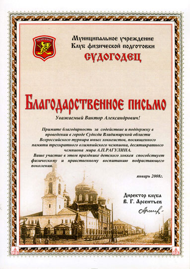 В январе 2008 года в городе Судогде Владимирской области прошел VII Всероссийский турнир юных хоккеистов памяти прославленного советского хоккеиста Александра Павловича Рагулина. Благодаря активной поддержке Ольги Юрьевны Рагулиной – вдовы Александра Павловича, администрации Судогодского района, городской Мэрии и самоотверженной работе руководства Клуба физической подготовки «Судогодец» турнир стал одним из главных событий в жизни города.