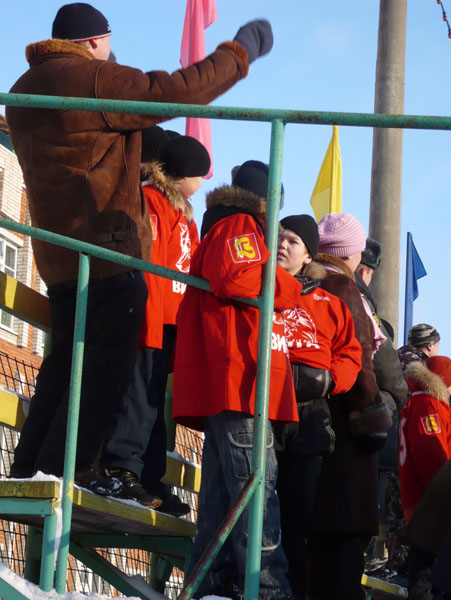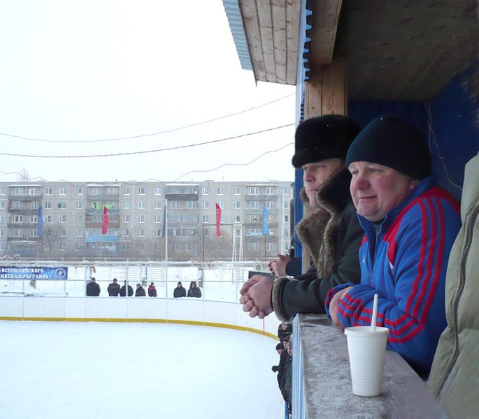 Самые заинтересованные болельщики: глава администрации города Судогды Александр Смирнов и руководитель клуба «Судогодец» Владимир Арсентьев Матч завершился победой судогодцев, что при отсутствии искусственного льда можно расценивать как значительное достижение, ведь ребята имеют возможность тренироваться лишь несколько месяцев в году. Чего не скажешь о гостях турнира, в распоряжении которых имеются круглогодично действующие катки.