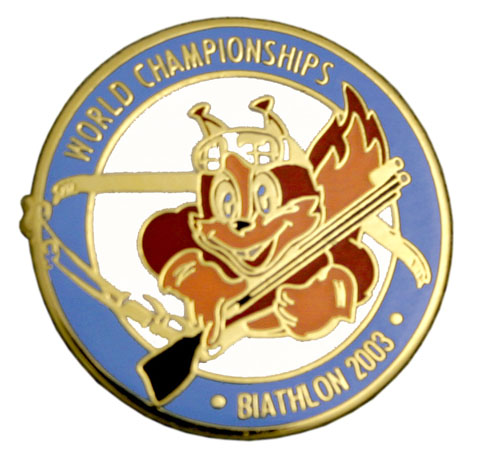 WORLD CHAMPIONSHIPS BIATHLON 2003 Значок Латунь, твердая эмаль Размеры: Ø 23 мм Застежка: цанга |