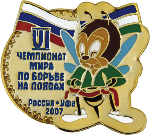 VI ЧЕМПИОНАТ МИРА ПО БОРЬБЕ НА ПОЯСАХ РОССИЯ – УФА 2007 Значок Латунь, мягкая эмаль Размеры: 25 х 23 мм Застежка: цанга |