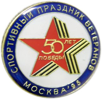 СПОРТИВНЫЙ ПРАЗДНИК ВЕТЕРАНОВ 50 ЛЕТ ПОБЕДЫ МОСКВА'95 Значок Железо, мягкая эмаль Размеры: Ø 25 мм Застежка: цанга |