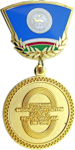 ОТЛИЧНИК ФИЗИЧЕСКОЙ КУЛЬТУРЫ И СПОРТА РЕСПУБЛИКИ САХА (ЯКУТИЯ) Знак Латунь, без эмали (подвеска) Латунь, твердая эмаль (колодка) Размеры: Ø 26 мм (подвеска) 25,55х20,13 мм (колодка) Застежка на колодке: булавка