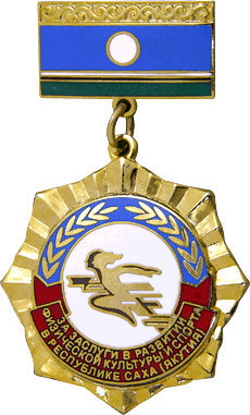 ЗА ЗАСЛУГИ В РАЗВИТИИ ФИЗИЧЕСКОЙ КУЛЬТУРЫ И СПОРТА В РЕСПУБЛИКЕ САХА (ЯКУТИЯ) Знак Латунь, твердая эмаль Размеры: Ø 39 мм (подвеска) 23,5х14 мм (колодка) Застежка на колодке: винт |