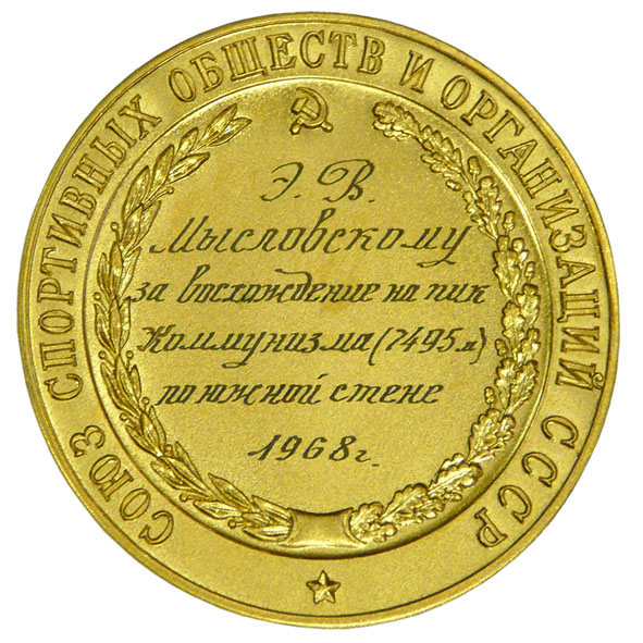 Юго-восточная стена пика Коммунизма. За восхождение по юго-западной стене пика Коммунизма (7495 м) в 1968 году Эдуард Мысловский был награждён медалью «За выдающееся спортивное достижение» и досрочно удостоен звания «Мастер спорта международного класса»