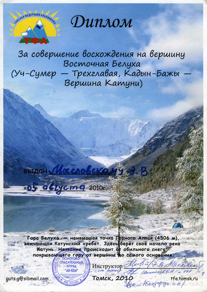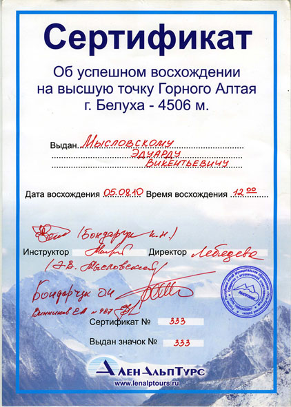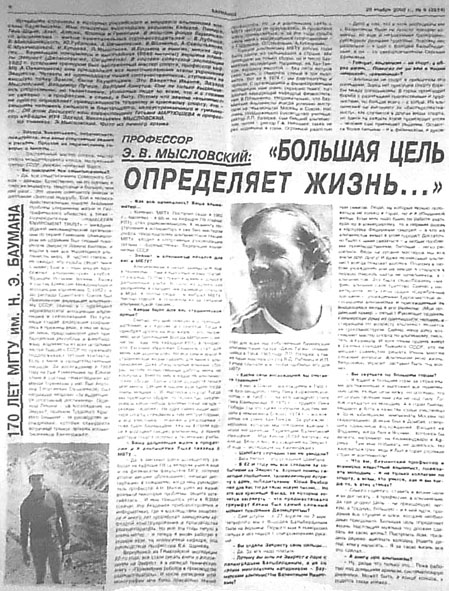 Эдуард Викентьевич Мысловский – участник (инструктор) восхождения на высшую точку Горного Алтая – пик Белуха (4506 м), посвящённого 180-летию МВТУ и памяти Н.М. Бондарчука, ректора Алтайского агроуниверситета, мастера спорта по альпинизму. Август 2010 года