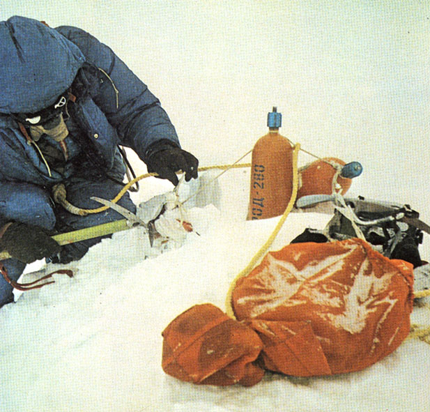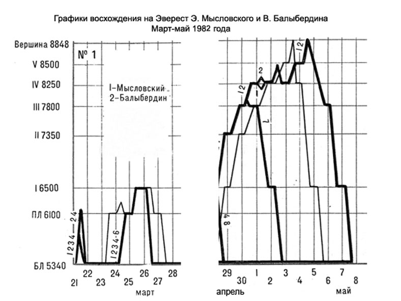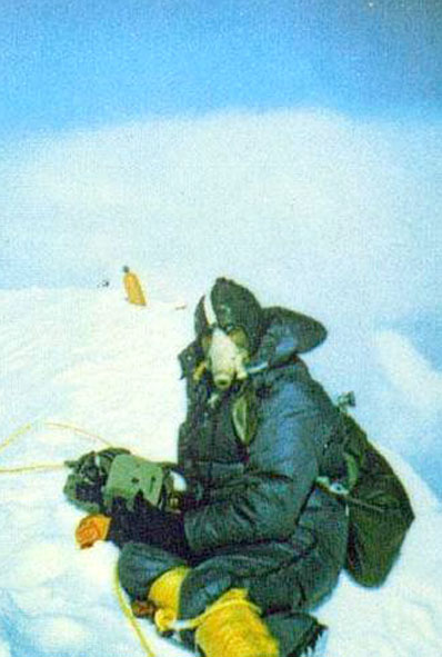 Владимир Балыбердин и Эдуард Мысловский поднялись на вершину Эвереста (8848 м) 4 мая 1982 года в 14:35, в 15:15 начали спуск
