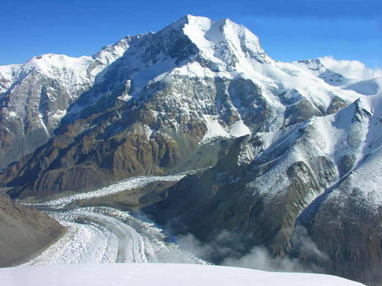 Пик Хан-Тенгри. В 1974 году сборная команда МВТУ под руководством Эдуарда Мысловского впервые прошла холодную северную стену пика Хан-Тенгри и стала чемпионом СССР. Фото Оксаны Мысловской, дочери Эдуарда Мысловского