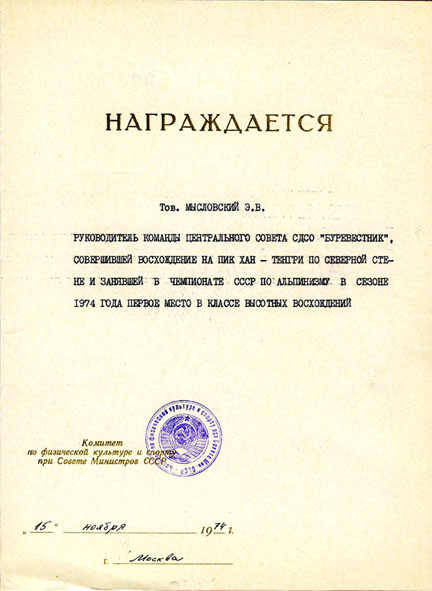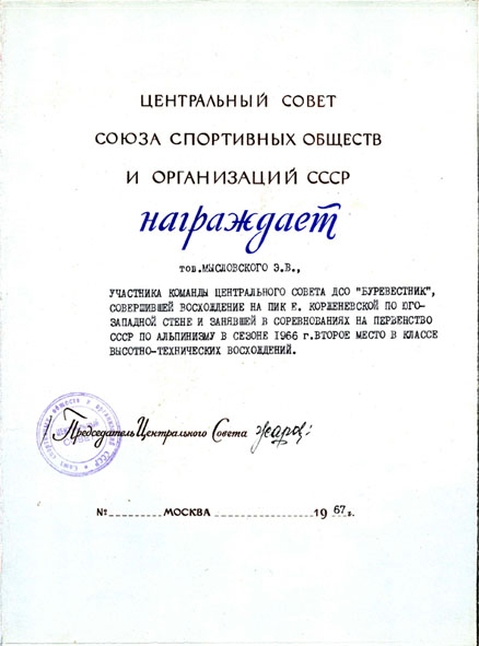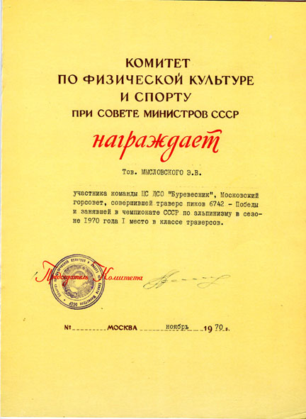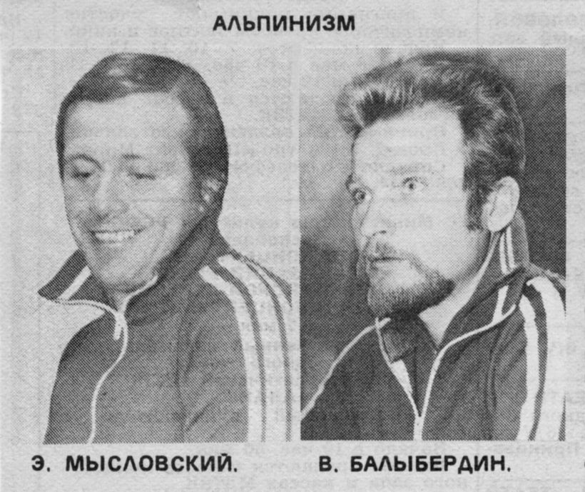 Эдуард Мысловский – чемпион СССР 1970 года в классе траверсов – траверс вершин Важи Пшавелы (6918 м), Победы (7439 м), Советской Армении (7039 м), Восточной Победы (7050 м) – в составе команды ЦС «Буревестник», состоявшей из альпинистов спортклуба МВТУ