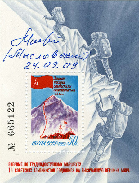 Почтовый блок, выпущенный в честь первого в истории советского альпинизма покорения Эвереста. Автограф Э.В. Мысловского