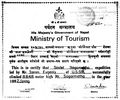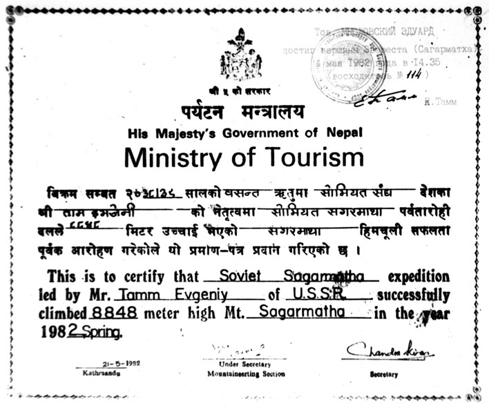 Сертификат Министерства туризма Непала, выданный советской альпинистской экспедиции под руководством Евгения Тамма об успешном достижении высоты 8848 метров горы Сагарматха весной 1982 года