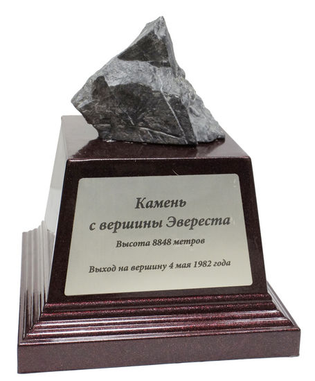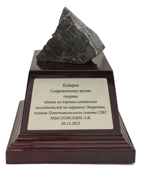 Камень с вершины Эвереста, снятый Мысловским Э.В. в ходе восхождения 1982 года, высота 8848 м, 4 мая 1982 года Подарен Современному музею спорта Мысловским Э.В. 20.12.2012 года