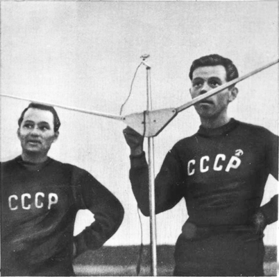 Мастера спорта М. Васильченко и Ю. Соколов демонстрируют полет радиоуправляемой модели планера на международных соревнованиях в Польше (1951 год)
