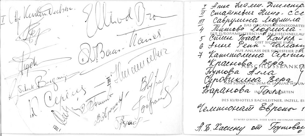 Автографы конькобежцев Геннадия Скворцова, Валерия Ханова,