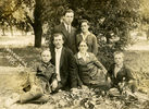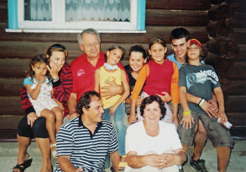 На даче. Почти все те же, но внуков прибавилось. Слева на коленях у дочери Кати младшая дочь Стася. Средней Саши нет на фотоснимке, потому что она фотографирует. Далее сидят на коленях в среднем ряду Маша, Аня и Никита – дети Владимира. Никита на коленях у Ивана, который уже успел вымахать под два метра. 2008 год. (Комментарий А. Иваницкого)