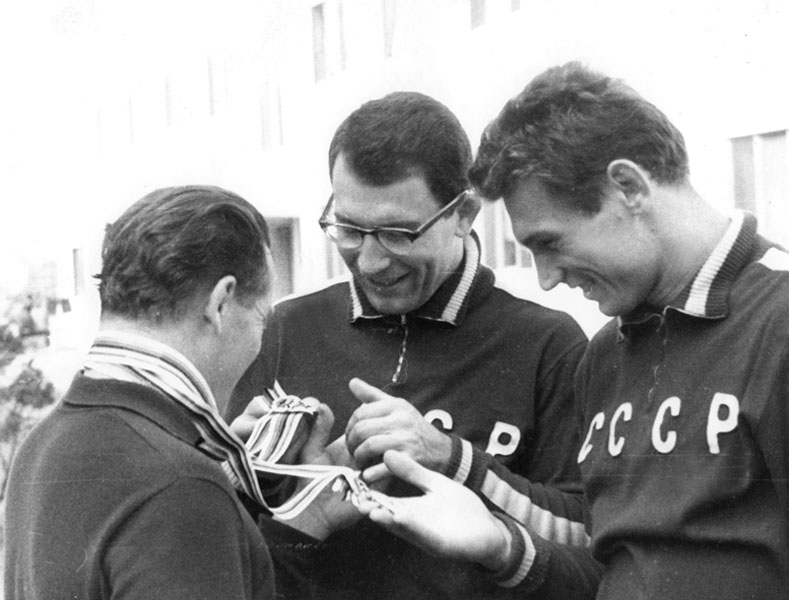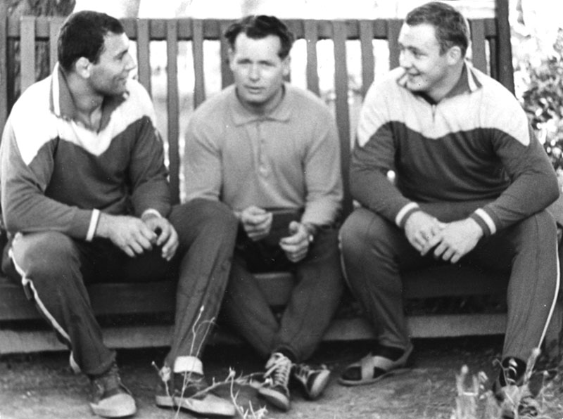 Перед Играми XVIII Олимпиады 1964 года в Токио с тренером Сергеем Андреевичем Преображенским и Евгением Надеждиным. Фото А. Ковозова