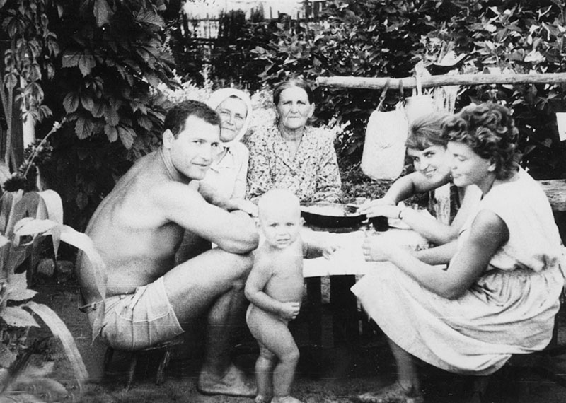 В гостях у бабушки с супругой Татьяной. 1963 год. Бабушка Мотя в центре. Мы с моим сыном Владимиром решили выступить без смокингов. Между мной и бабушкой сидит её родная сестра Фрося – моя тётя. Жаль, что у меня не сохранились их крупные фотографии. Лица у них иконописные. А по молодости – куда там до них тогдашним кинозвёздам! Такая была раньше крестьянская порода... (Комментарий А.В. Иваницкого)