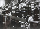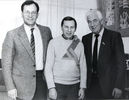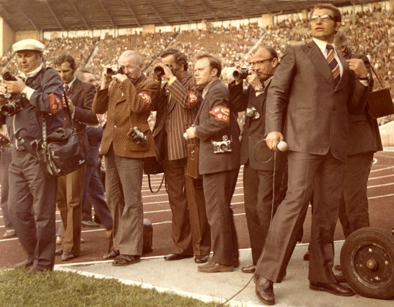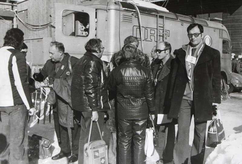 Группа советского телевидения на XII Олимпийских зимних играх 1976 года в Инсбруке. Первый справа – Александр Иваницкий. На комментаторской позиции с Н.Н. Озеровым. Фото слева: на комментаторской позиции со знаменитым телерадиокомментатором и актёром Николаем Николаевичем Озеровым (в центре). Слева от него – французский телекомментатор. Завершается хоккейный матч. Не помню за давностью лет, кого с кем. Разрыв в счёте солидный. Французский комментатор говорит своим телезрителям: «Досматривайте эту потасовку без меня. И так ясно, чем она закончится, а я пойду в пресс-центр, выпью чашечку кофе». Мне такой оборот в диковинку. Попробуй кто из нас на нашем Гостелерадио отчебучить подобное! (Комментарий А.В. Иваницкого)