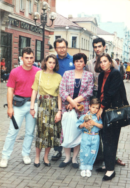 Семья Иваницких (слева направо): сын Владимир, его супруга Наташа, супруга Александра Владимировича Иваницкого Татьяна Владимировна, супруг дочери Кати Максим, дочь Катя и внук Иван. Москва, Арбат, 1990 год