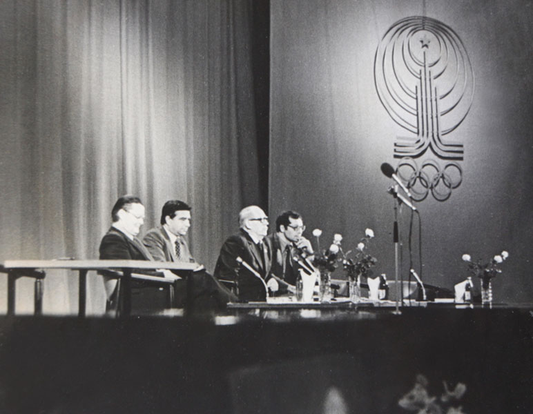 Совещание руководства Гостелерадио СССР по организации трансляций Игр XXII Олимпиады 1980 года в Москве. Слева направо: начальник Главного управления внешних сношений Гостелерадио СССР Л.А. Королёв; заместитель председателя Гостелерадио СССР Г.З. Юшкявичус (ключевой человек в телевоплощении «Олимпиады-80», зампредседателя по технике; блестящий знаток спорта и телевизионных технологий, схватывал идеи с полуслова, да и сам на них был неиссякаем; будущий крупный советский дипломат); председатель Гостелерадио СССР С.Г. Лапин (являл собой редкий пример умного государственного деятеля; его многие боялись как огня, но если шёл к нему по делу, принимал тотчас же, хоть днём, хоть ночью). Масштабные были люди… Крайний справа – ваш покорный слуга. (Комментарий А.В. Иваницкого)
