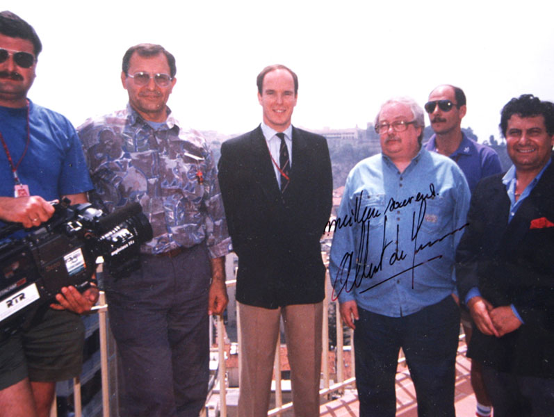В Монте-Карло на автогонках в классе машин FI с принцем Княжества Монако Альбертом (в центре), генеральным директором ВГТРК Анатолием Лысенко (справа) и спортивным журналистом Алексеем Бурковым (ещё правее). Автограф принца Альберта. 1994 год