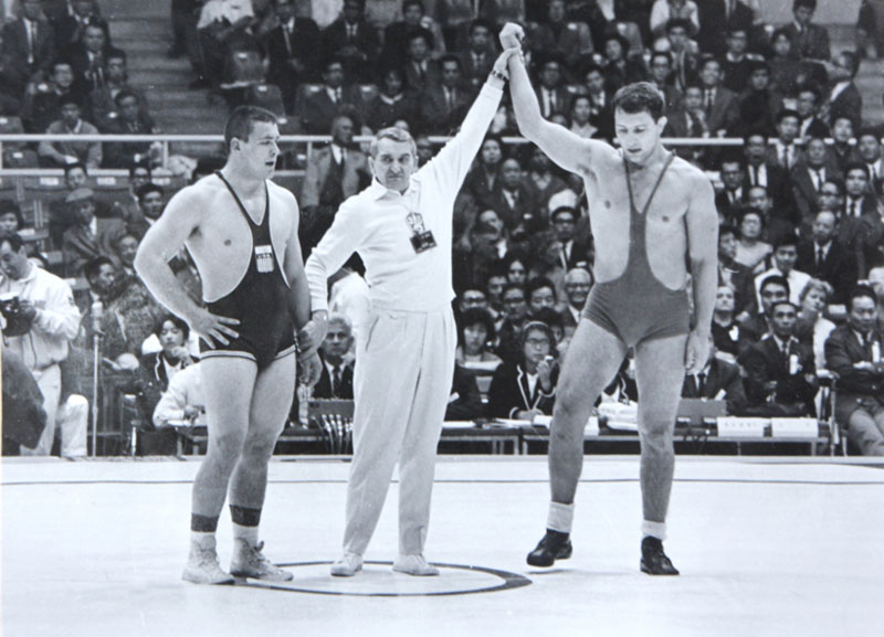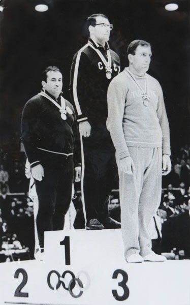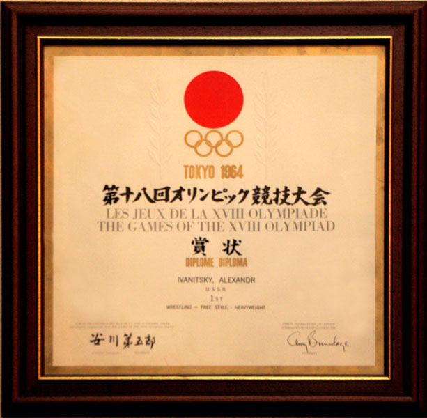 Чемпион Игр XVIII Олимпиады 1964 года в Токио по вольной борьбе в весовой категории свыше 97 км Александр Иваницкий. Пьедестал почёта: Л Ахмедов (Болгария), А.Иваницкий (СССР), Х.Каплан (Турция). Диплом олимпийского чемпиона