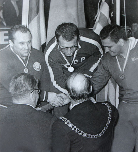 Чемпионат мира 1965 года в Манчестере (Англия). Пьедестал почета: обладатель золотой медали А.Иваницкий (СССР), серебряный призёр Л.Ахмедов (Болгария), бронзовый – Л.Кристоф (США)