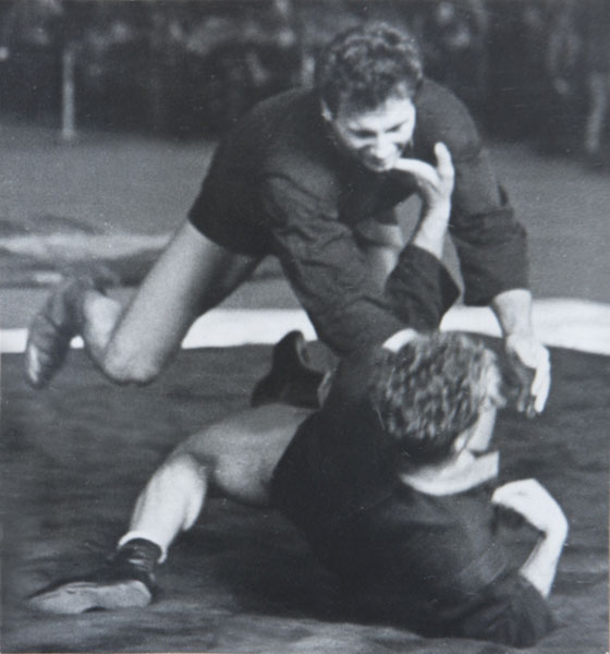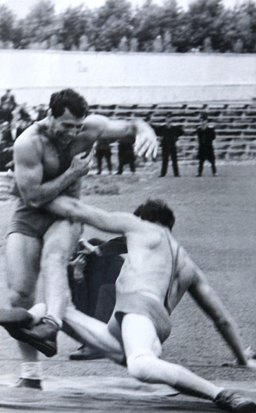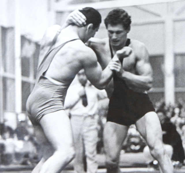Любимый фотоснимок Александра Иваницкого. Чемпионат мира 1966 года в Толидо (США). Соперник Бок (ФРГ). Подсечка в полёте – почти балетное антраша, и это когда вес зашкаливает далеко за сотню. Бок после такого «пантерного» наскока грохается с высоты своих двух метров плашмя на ковёр. Лопатки, чистая победа. (Комментарий А. Иваницкого)