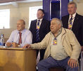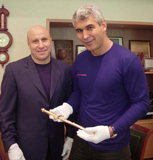 «За огромный вклад в дело развития России, за помощь в проведении международного сбора молодежи военно-спортивной организации государств-членов Организации Договора о коллективной безопасности (ОБКБ)» председатель Регионального общественного движения «Доблесть Отечества» Олег Баканач вручает президенту Федерации спортивной борьбы России Михаилу Мамиашвили золотой именной кортик, изготовленный мастерами оружейной фабрики «Златоуст»